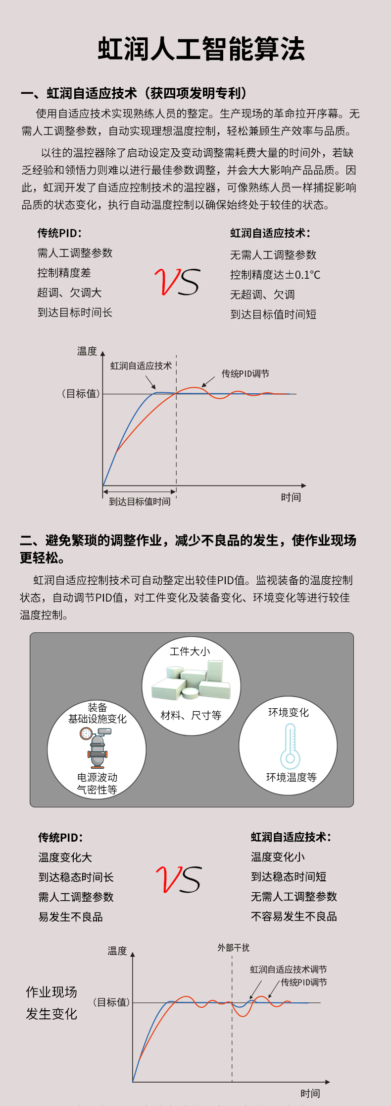 虹潤(rùn)公司是專(zhuān)業(yè)生產(chǎn)溫控器的國(guó)家專(zhuān)精特新“小巨人”企業(yè)。生產(chǎn)的人工智能溫控器,具有真正人工智能算式,無(wú)需人工整定參數(shù),控制精度可達(dá)±0.1°C,多種輸出類(lèi)型,高抗干擾等特點(diǎn)。產(chǎn)品獲得模糊PID控制儀及控制方法、人工智能調(diào)節(jié)器、智能化控制器、移相觸發(fā)控制器、閥門(mén)自動(dòng)手動(dòng)無(wú)擾動(dòng)操作控制方法及裝置等5項(xiàng)國(guó)家發(fā)明專(zhuān)利,主持起草工業(yè)過(guò)程控制系統(tǒng)用模擬輸入兩位或多位輸出儀表、物聯(lián)網(wǎng)智能溫度儀表通用技術(shù)條件、工業(yè)過(guò)程測(cè)量和控制系統(tǒng)用智能調(diào)節(jié)器等3項(xiàng)國(guó)家標(biāo)準(zhǔn),以及通信系統(tǒng)多通道數(shù)據(jù)采集控制終端規(guī)范軍用標(biāo)準(zhǔn),參與國(guó)際5G標(biāo)準(zhǔn)制定,取得模糊PID溫控儀等3項(xiàng)相關(guān)軟件著作權(quán)。產(chǎn)品廣泛應(yīng)用于電力、石化,冶金、制藥、食品等幾乎所有工業(yè)現(xiàn)場(chǎng),實(shí)現(xiàn)精準(zhǔn)控溫,保障生產(chǎn)安全與質(zhì)量。