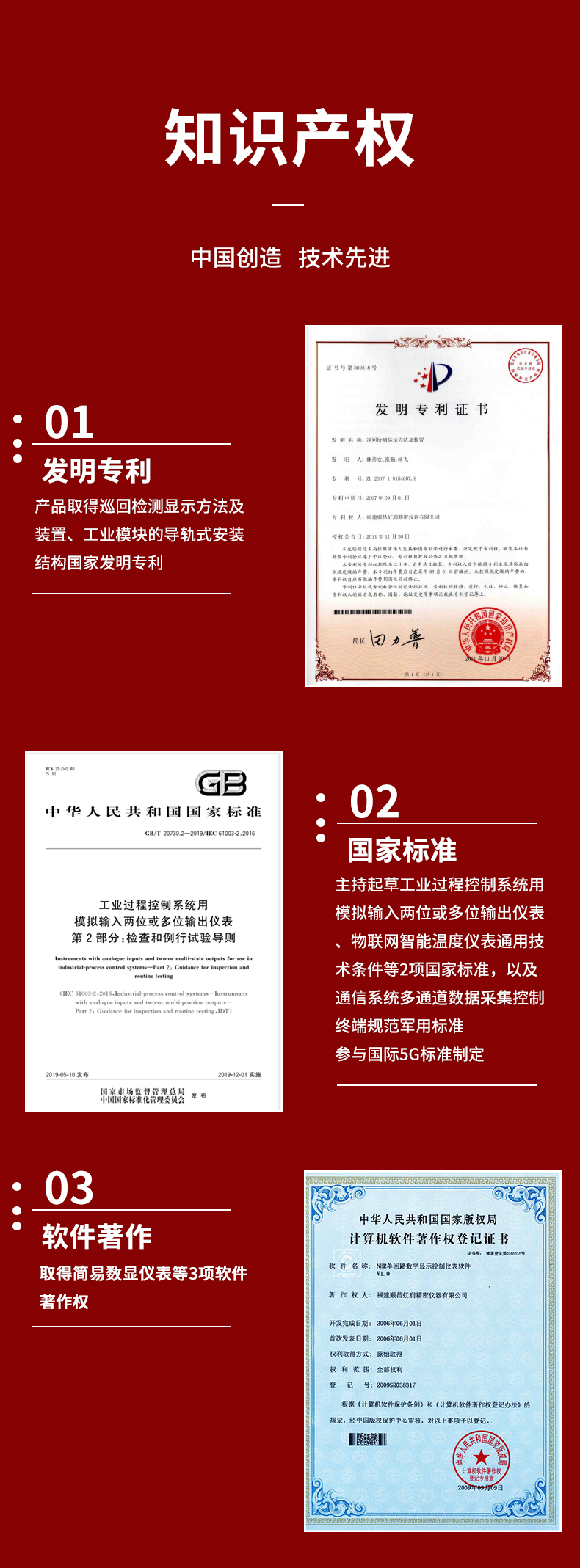 虹潤公司是專業(yè)生產(chǎn)數(shù)顯表的國家專精特新“小巨人”企業(yè),生產(chǎn)的導(dǎo)軌式數(shù)顯儀表,具有全切換信號輸入,導(dǎo)軌壁掛共用,全隔離設(shè)計,高抗干擾,變送輸出或RS485通訊等特點(diǎn)。產(chǎn)品獲得巡回檢測顯示方法及裝置、工業(yè)模塊的導(dǎo)軌式安裝結(jié)構(gòu)等2項國家發(fā)明專利,主持起草工業(yè)過程控制系統(tǒng)用模擬輸入兩位或多位輸出儀表、物聯(lián)網(wǎng)智能溫度儀表通用技術(shù)條件等2項國家標(biāo)準(zhǔn),,以及通信系統(tǒng)多通道數(shù)據(jù)采集控制終端規(guī)范軍用標(biāo)準(zhǔn),參與國際5G標(biāo)準(zhǔn)制定,取得簡易數(shù)顯儀表等3項相關(guān)軟件著作權(quán)。產(chǎn)品廣泛應(yīng)用于電力、石化、冶金、化工、造紙、食品、輕工、制藥、熱處理、水處理、機(jī)械配套等各種工業(yè)現(xiàn)場。
